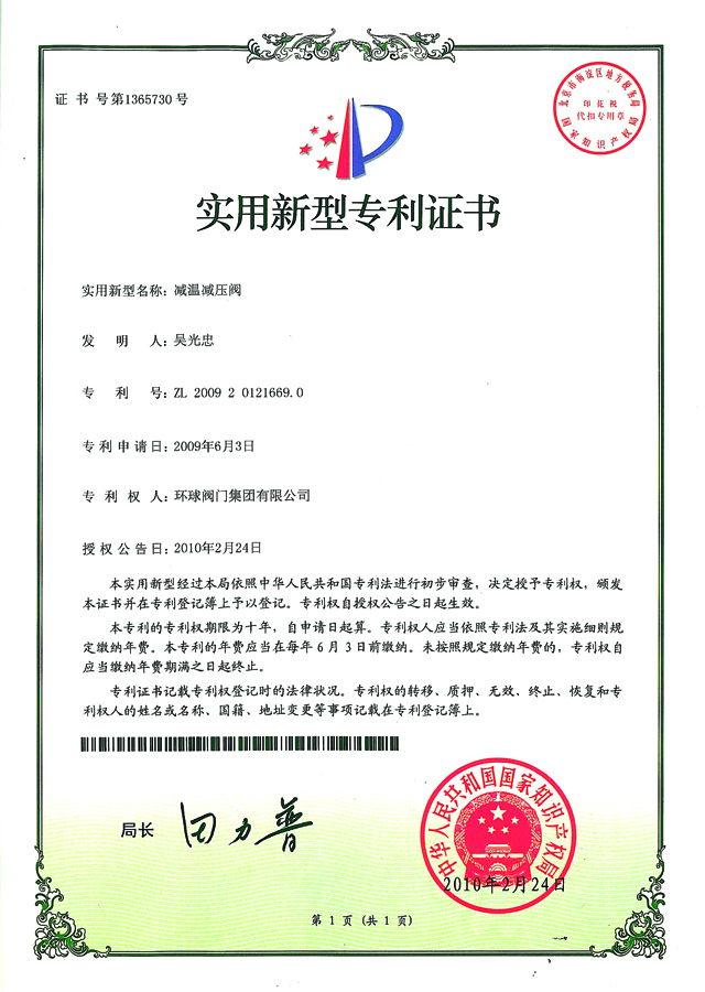 專利證書減溫減壓閥